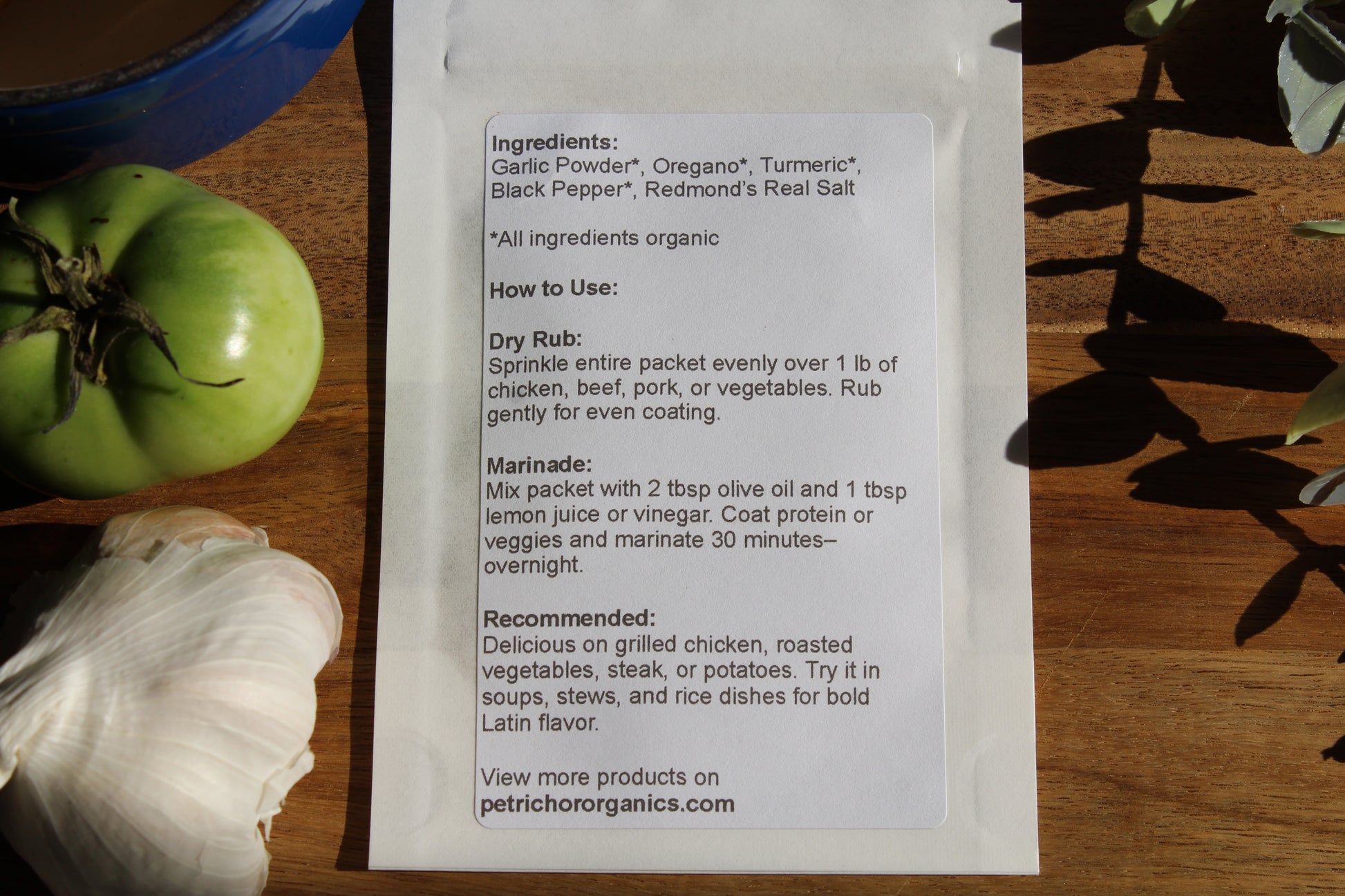 Made with organic ingredients. One packet seasons 1 pound of food.
